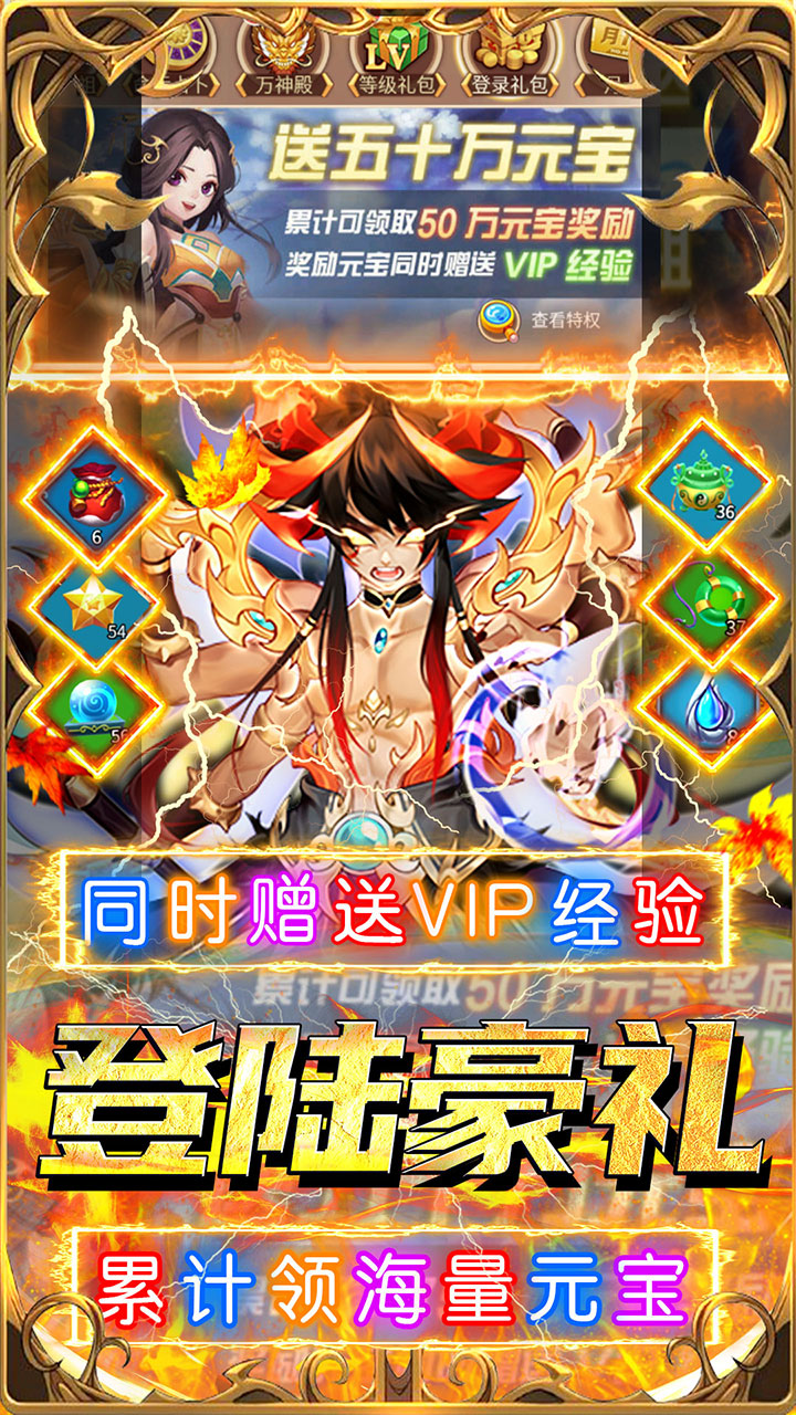 1,登录礼包,每日登录都有好礼相送! 2,累计登录奖励海量元宝同时还赠送超多vip经验! 3,七日福利,完成七日目标领取神将弥勒佛祖! 4,节日活动,登录送豪礼,海量元宝、仙人信物等道具免费领!